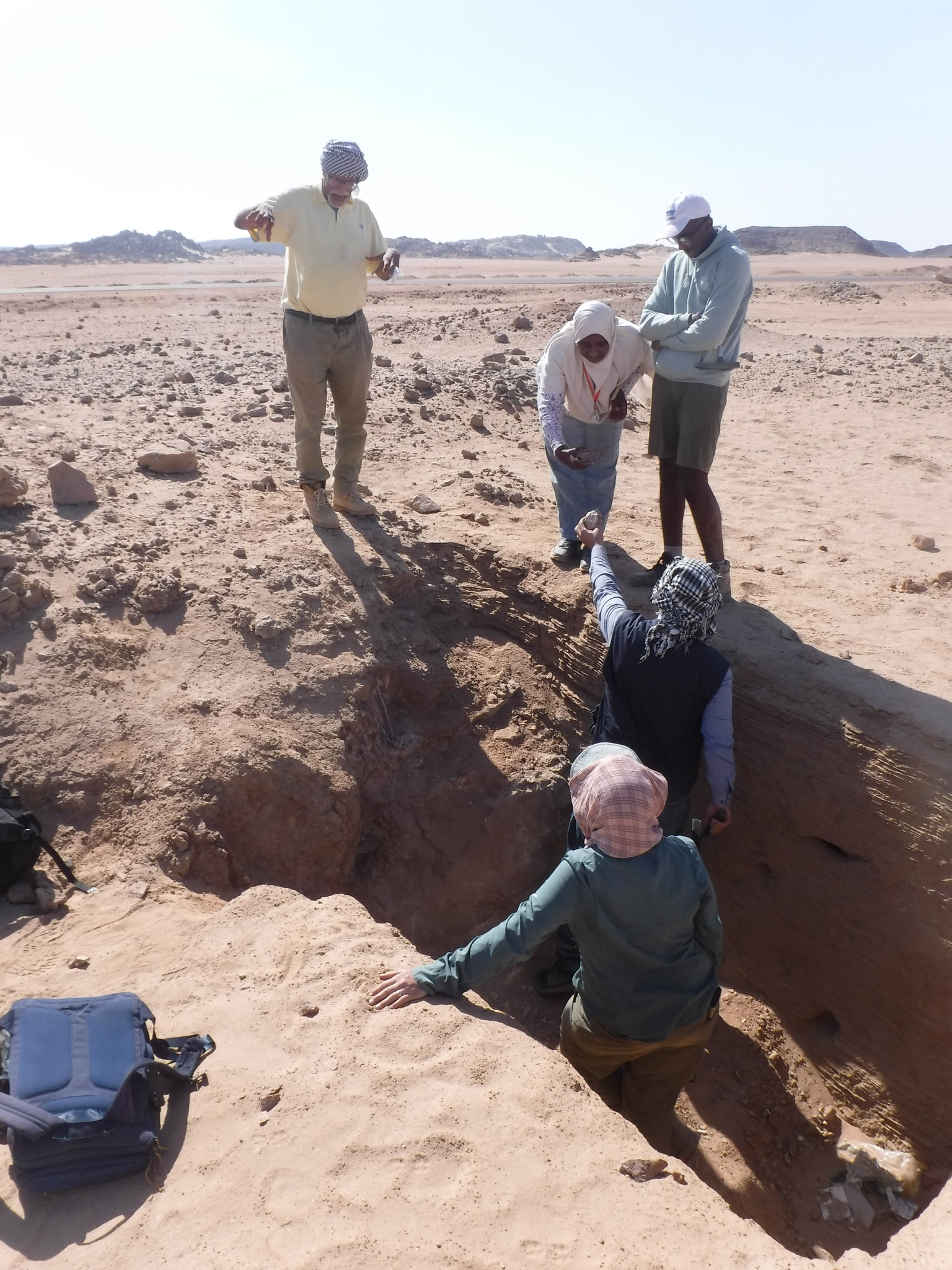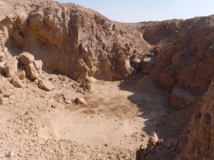El equipo de Ahmed Fakhry originalmente identificó el Yacimiento 8 en 1952[1] y fue visitado otra vez de manera breve por Ian Shaw y Robert Jameson en 1992[2]. Es el yacimiento más cercano a Asuán localizado en una llanura arenosa entre colinas de granito. Originalmente, Fakhry identificó el Yacimiento 8 como la posible localización de un pozo. No obstante, después de haber estudiado la superficie y haber excavado allí, entramos en desacuerdo con dicha identificación. En la antigüedad, tres agujeros de tamaño medio fueron excavados en esta área, que creemos que eran minas y no pozos. Sus montones de despojos forman una larga pila en el centro del yacimiento y alrededor de 10 cabañas grandes fueron construidas más tarde en los laterales del montículo. Restos del Reino Medio, de la época ptolemaica, y de época romana se encuentran aquí, incluida una estela de punta redonda y su base, del Reino Medio, sin inscribir. Una zanja, de estudio preliminar, fue excavada en estos agujeros en 2021, la cual reveló niveles horizontales muy estrechos de arena creados por miles de años de situaciones con eventos lluviosos. De acuerdo con el geólogo Dr. Mohamed Hamdam de la Universidad del Cairo[3], el agujero no pudo haber sido un pozo debido a la uniformidad de las estrías del pozo; si este fuera un pozo, el agua moviéndose en el fondo habría creado una ondulación en estos niveles. Además, encontramos piezas de cuarzo lechoso. Tampoco hay evidencia que apoye la existencia de un pozo; no hay escalera o asideras para acceder al fondo del pozo, ni jarros de agua rotos. Nuestra búsqueda para encontrar cualquier fuente antigua de agua en Wadi el-Hudi continua, pero por ahora el escenario más probable es que constantes caravanas de abastecimiento fueran necesarias para llevar comida y agua a las expediciones mineras desde el Valle del Nilo.