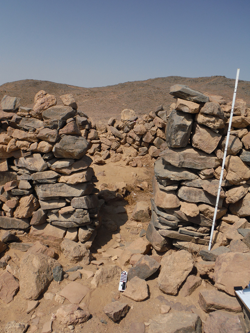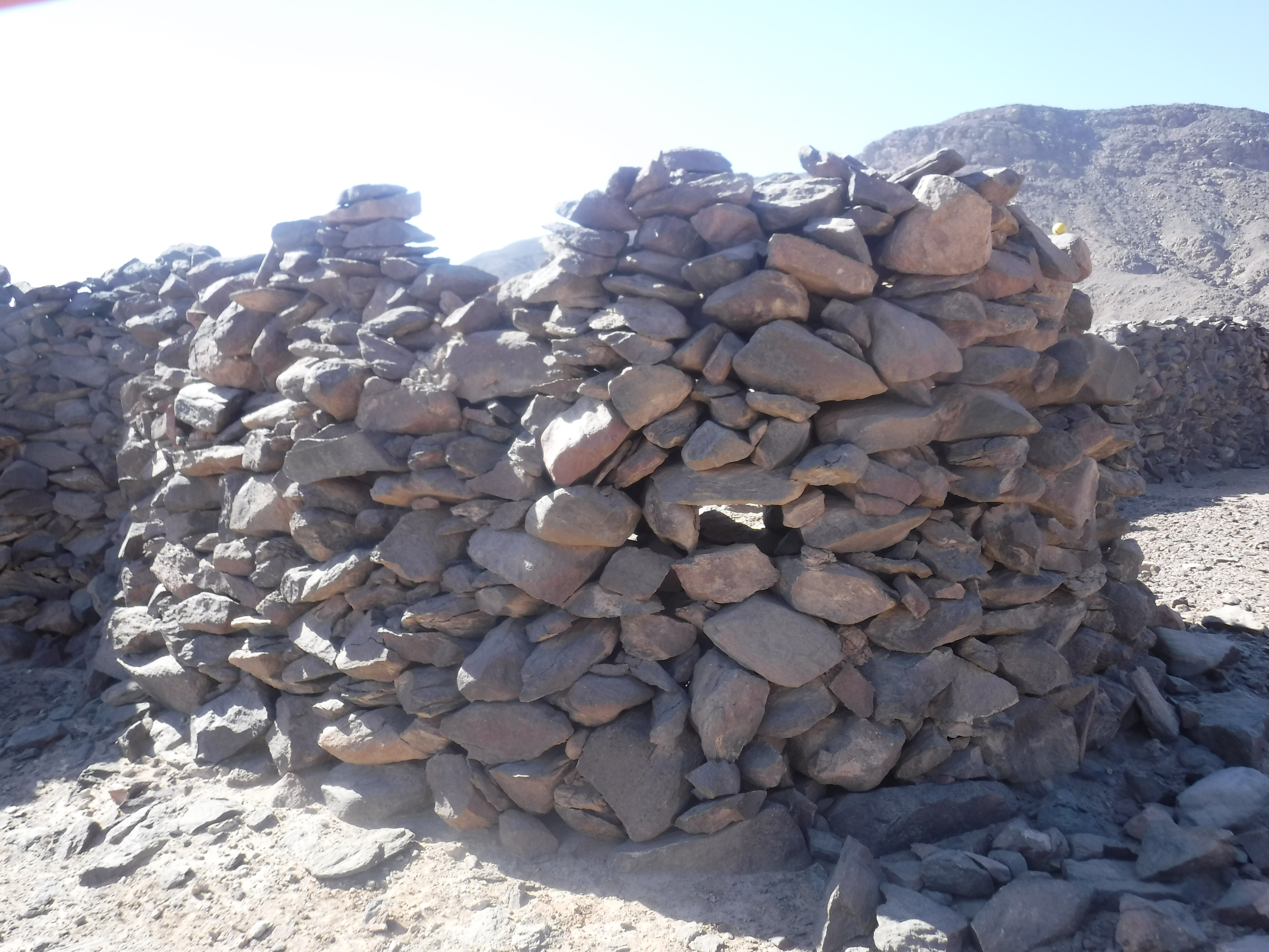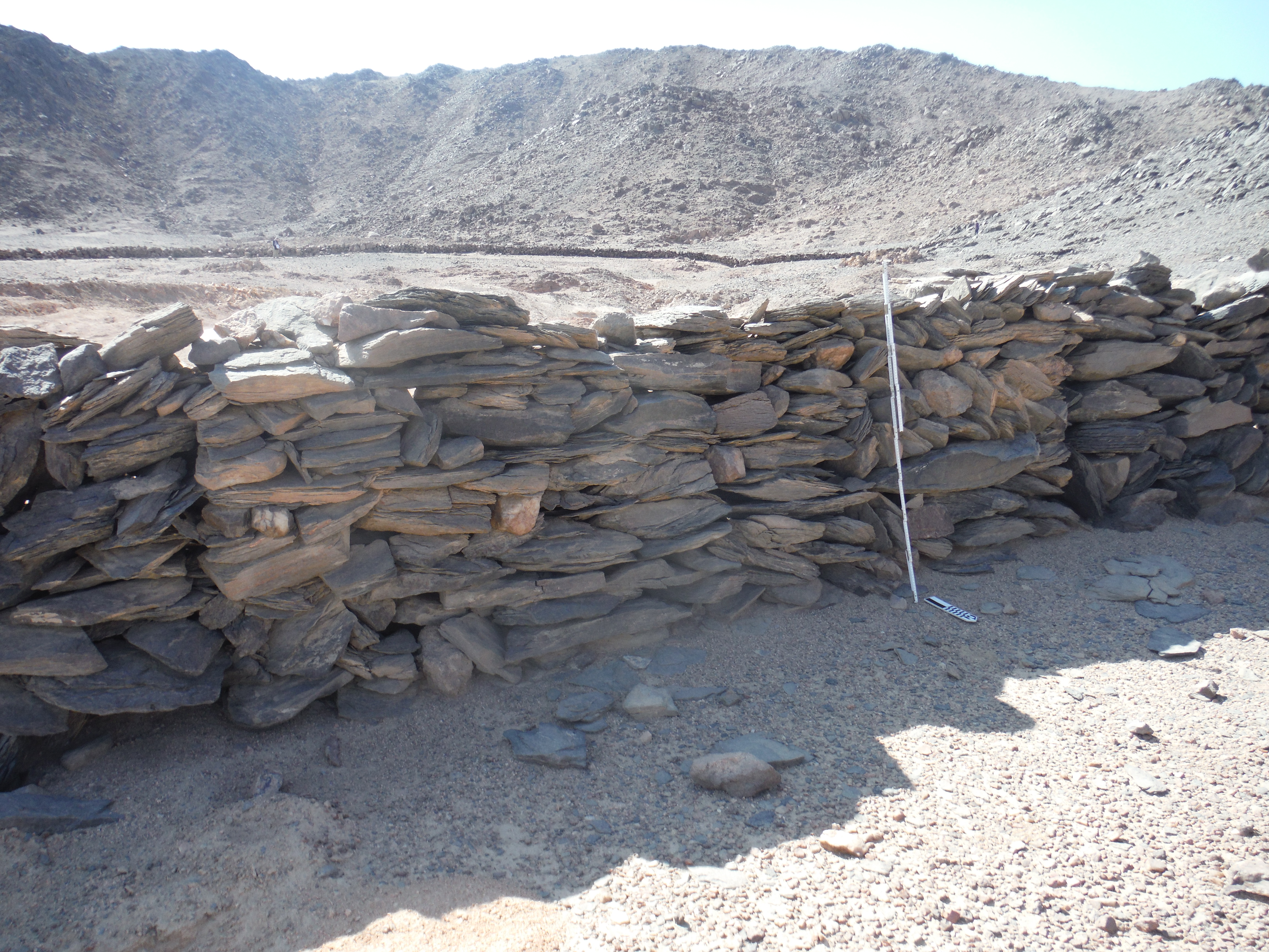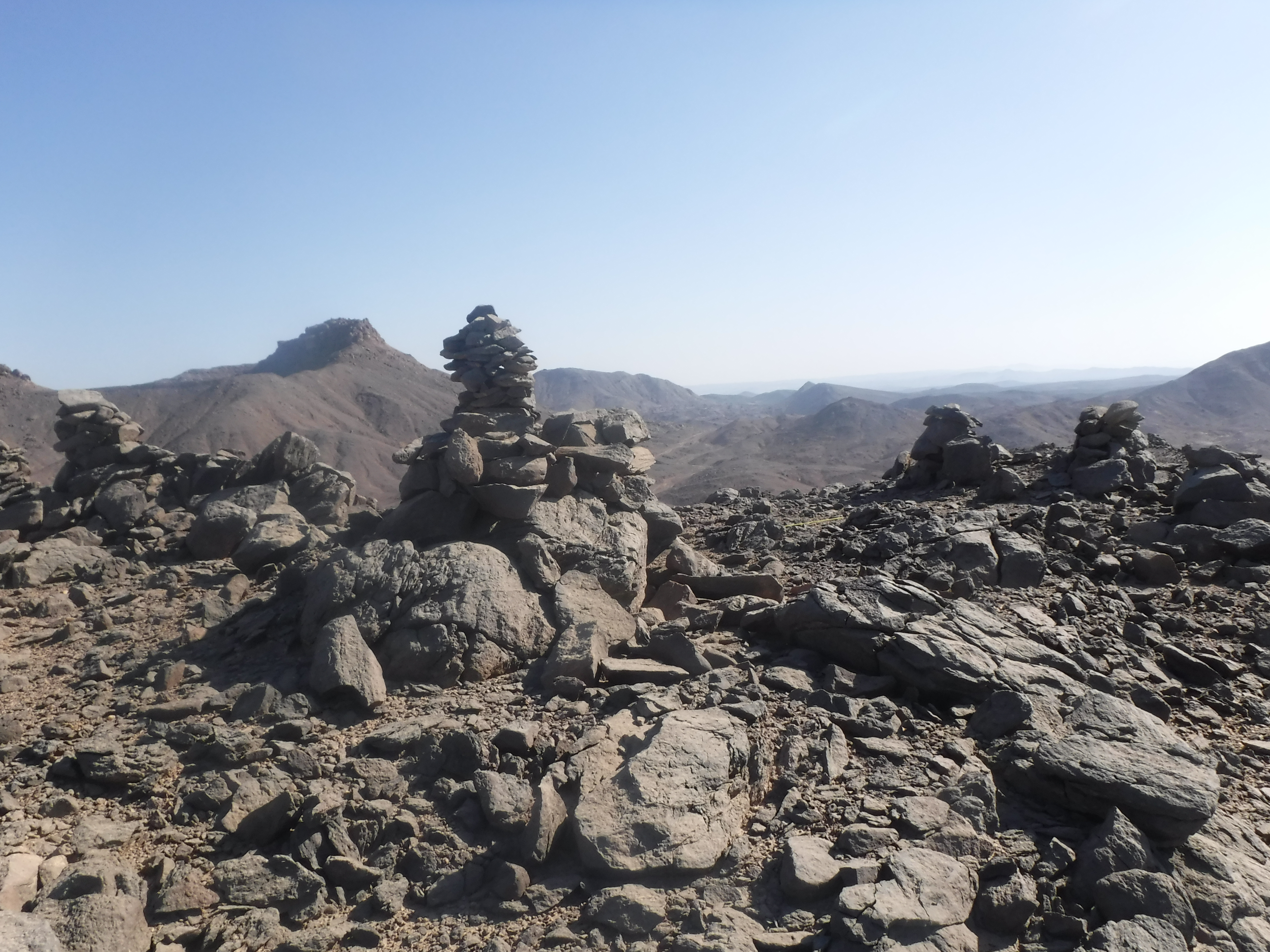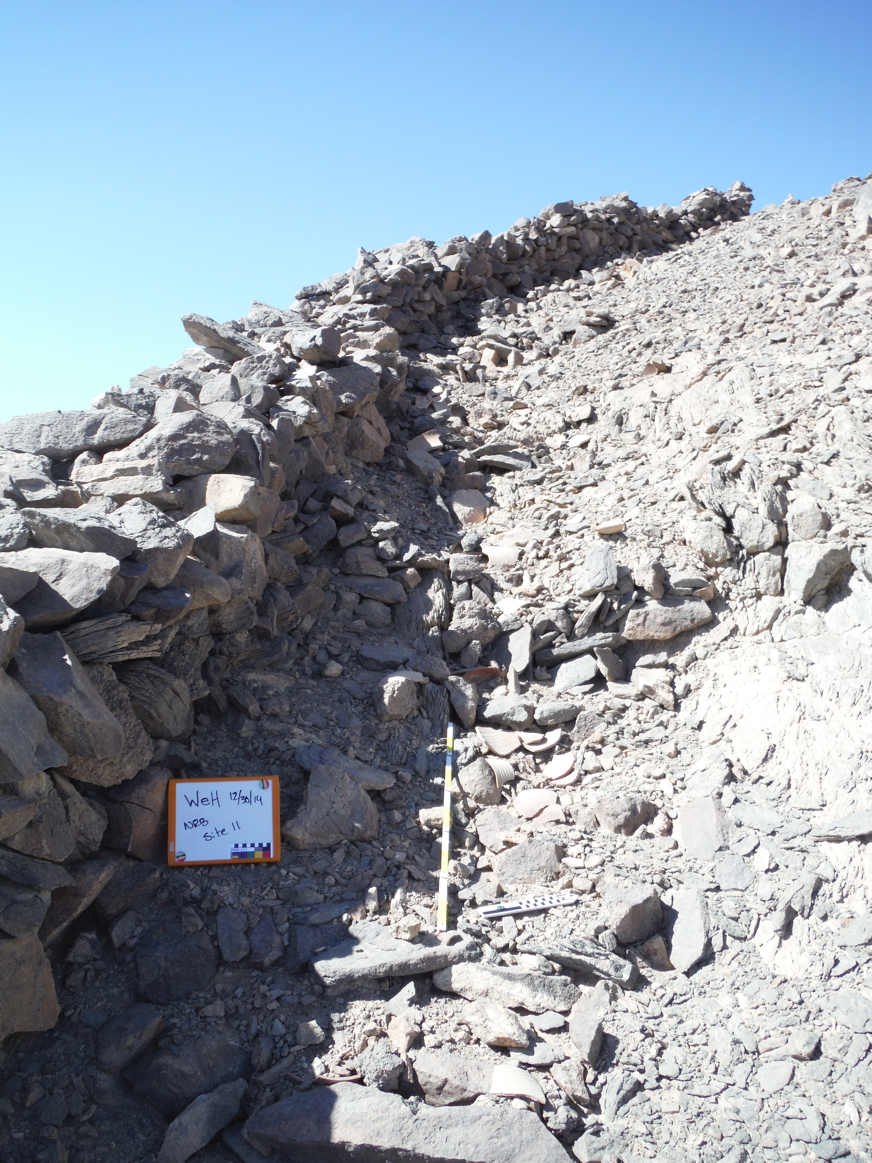 En la cima de la colina norte, con vistas a Dihmit Sur hay una cresta de doble ensilladura donde se construyeron casi 30 mojones, un patio de mojones, y 6 rocas erguidas. También descubrimos tres estelas escritas por funcionarios. Hay tantos mojones que esta zona parece haber sido construida con algo más que un propósito de navegación o vigilancia. Por comparación con otros asentamientos mineros del Reino Medio, como el de Stelae Ridge en Gebel el-Asir[2], es posible concluir que esta colina cubierta de mojones quizá se creó para prácticas religiosas. Adicionalmente, se pueden ver caminos, cabañas, mojones y otros fenómenos arqueológicos en todas las direcciones. Los diferentes elementos que pudimos observar tanto en persona como a distancia demuestran que Dimith Sur fue probablemente el centro de una vasta red de yacimientos mineras en el Reino Medio.