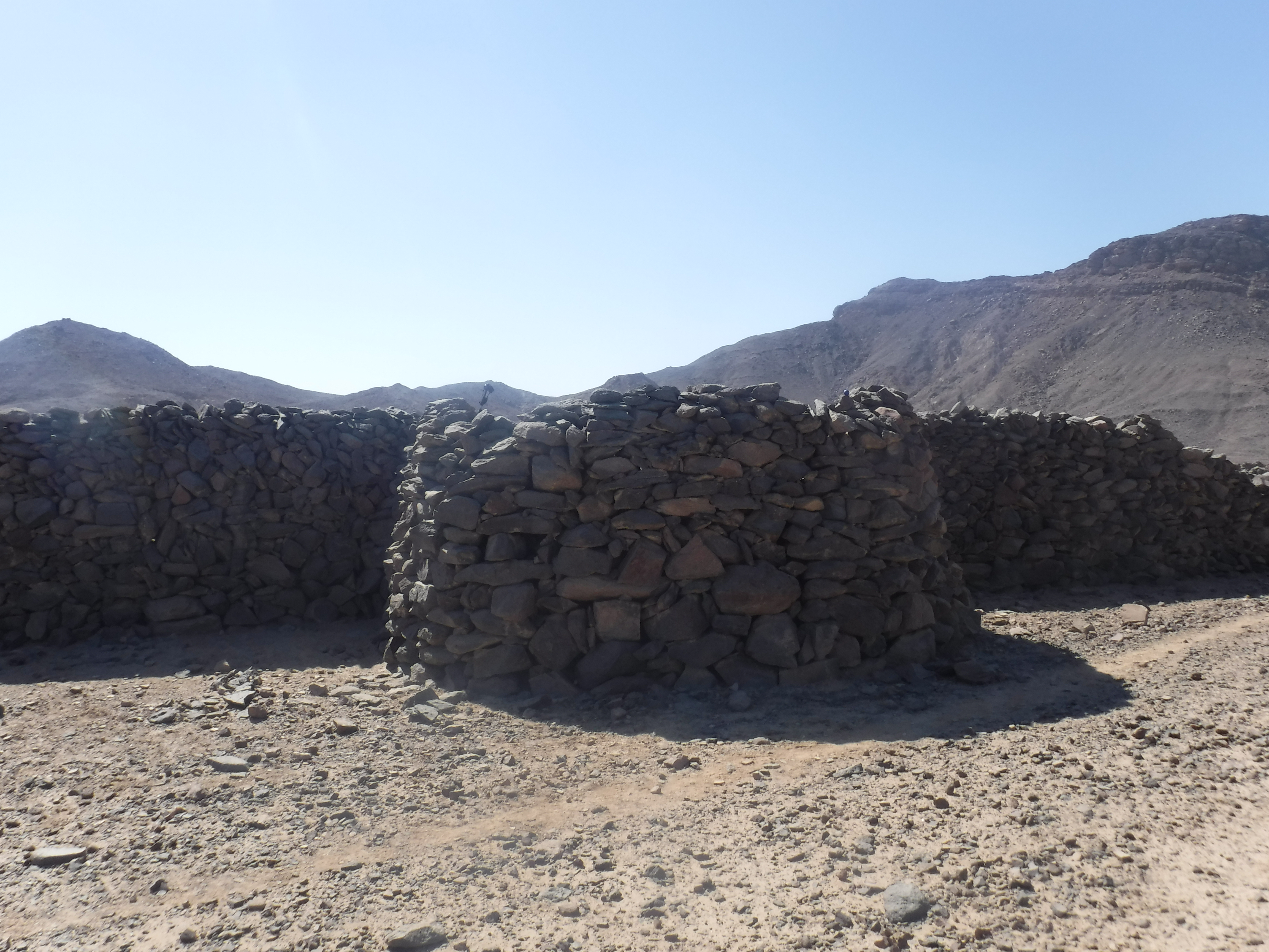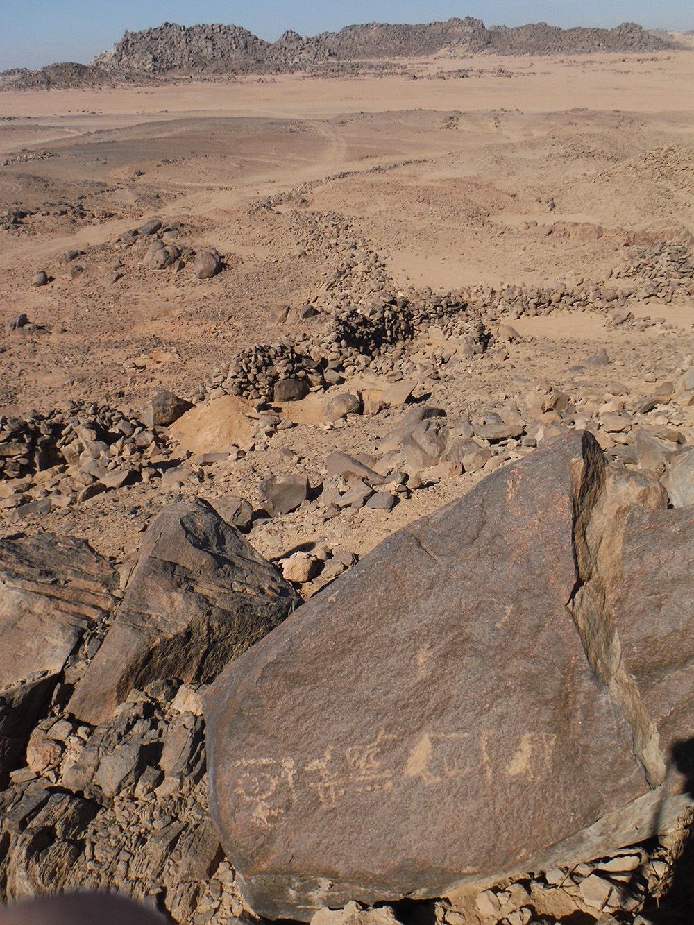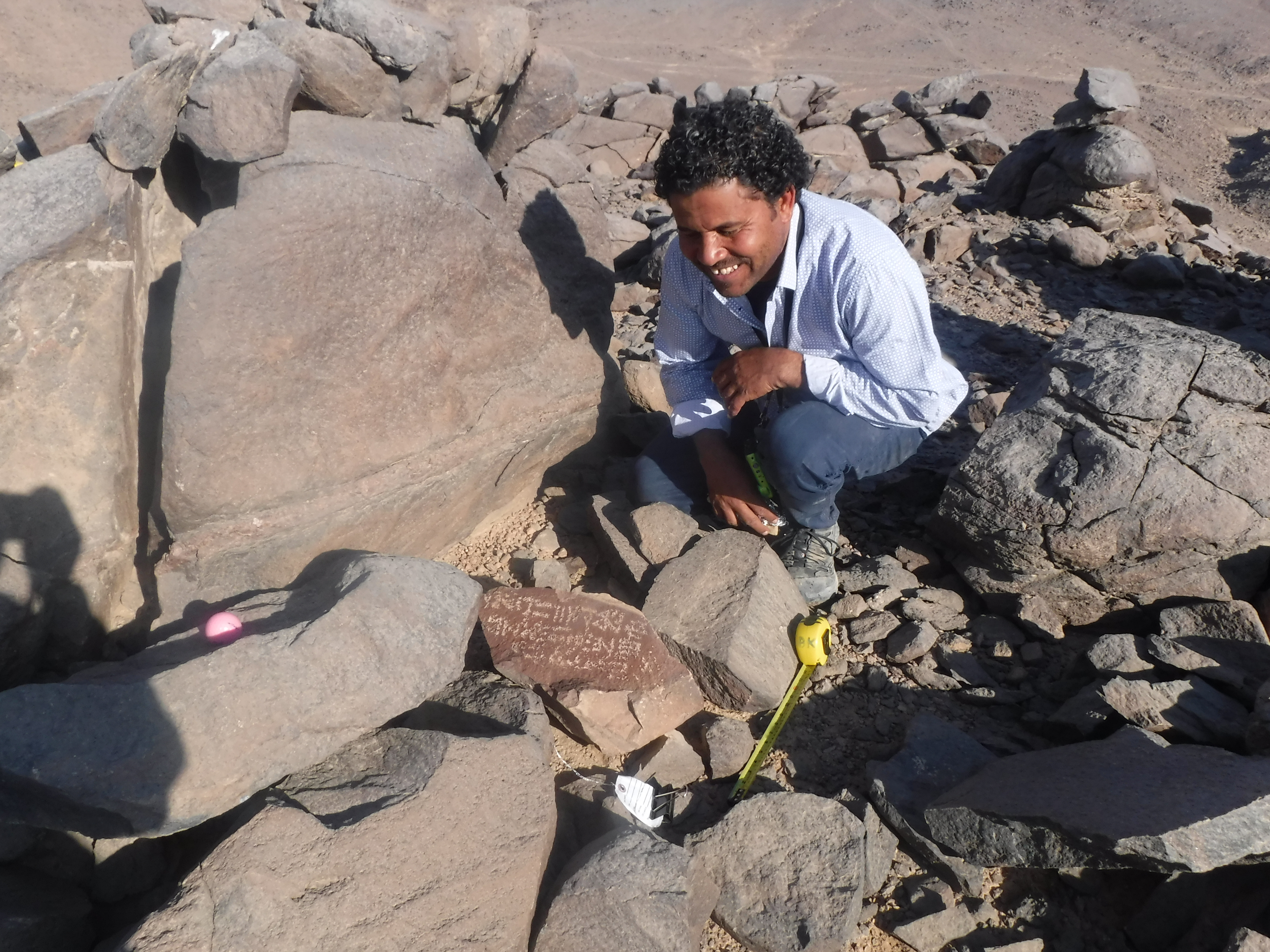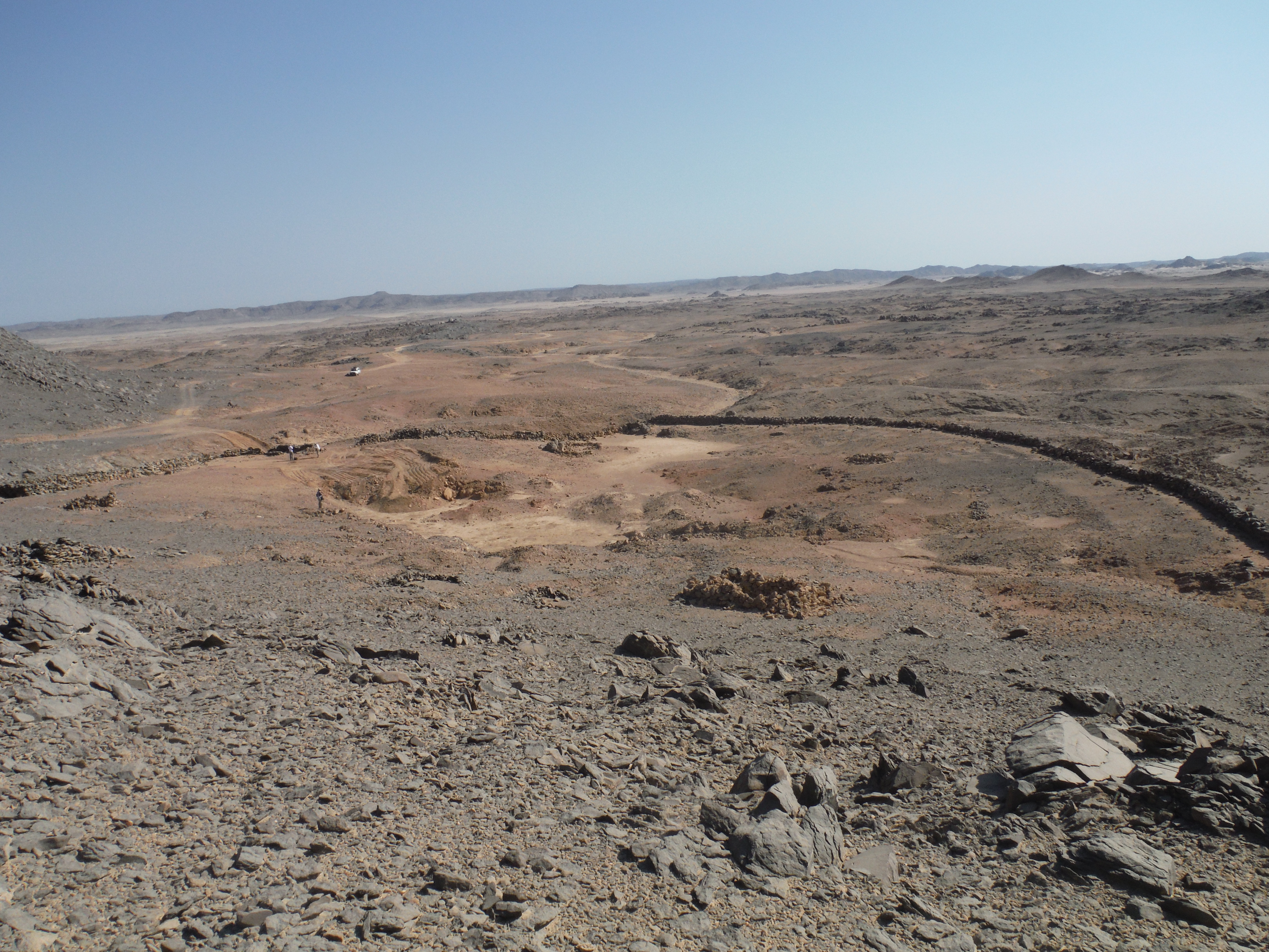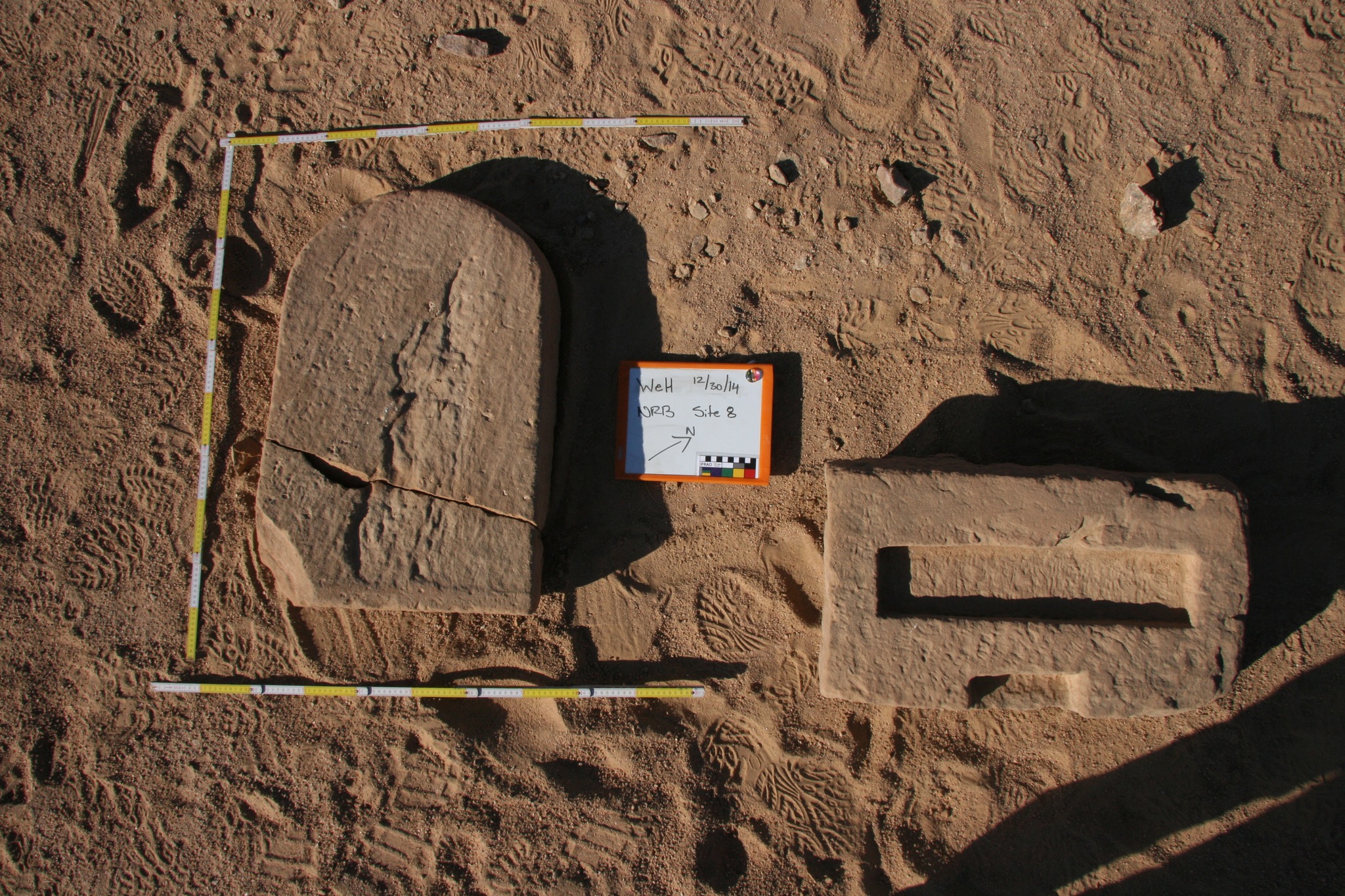 En la cima de la colina norte, con vistas a Dihmit Sur hay una cresta de doble ensilladura donde se construyeron casi 30 mojones, un patio de mojones, y 6 rocas erguidas. También descubrimos tres estelas escritas por funcionarios. Hay tantos mojones que esta zona parece haber sido construida con algo más que un propósito de navegación o vigilancia. Por comparación con otros asentamientos mineros del Reino Medio, como el de Stelae Ridge en Gebel el-Asir[2], es posible concluir que esta colina cubierta de mojones quizá se creó para prácticas religiosas. Adicionalmente, se pueden ver caminos, cabañas, mojones y otros fenómenos arqueológicos en todas las direcciones. Los diferentes elementos que pudimos observar tanto en persona como a distancia demuestran que Dimith Sur fue probablemente el centro de una vasta red de yacimientos mineras en el Reino Medio.