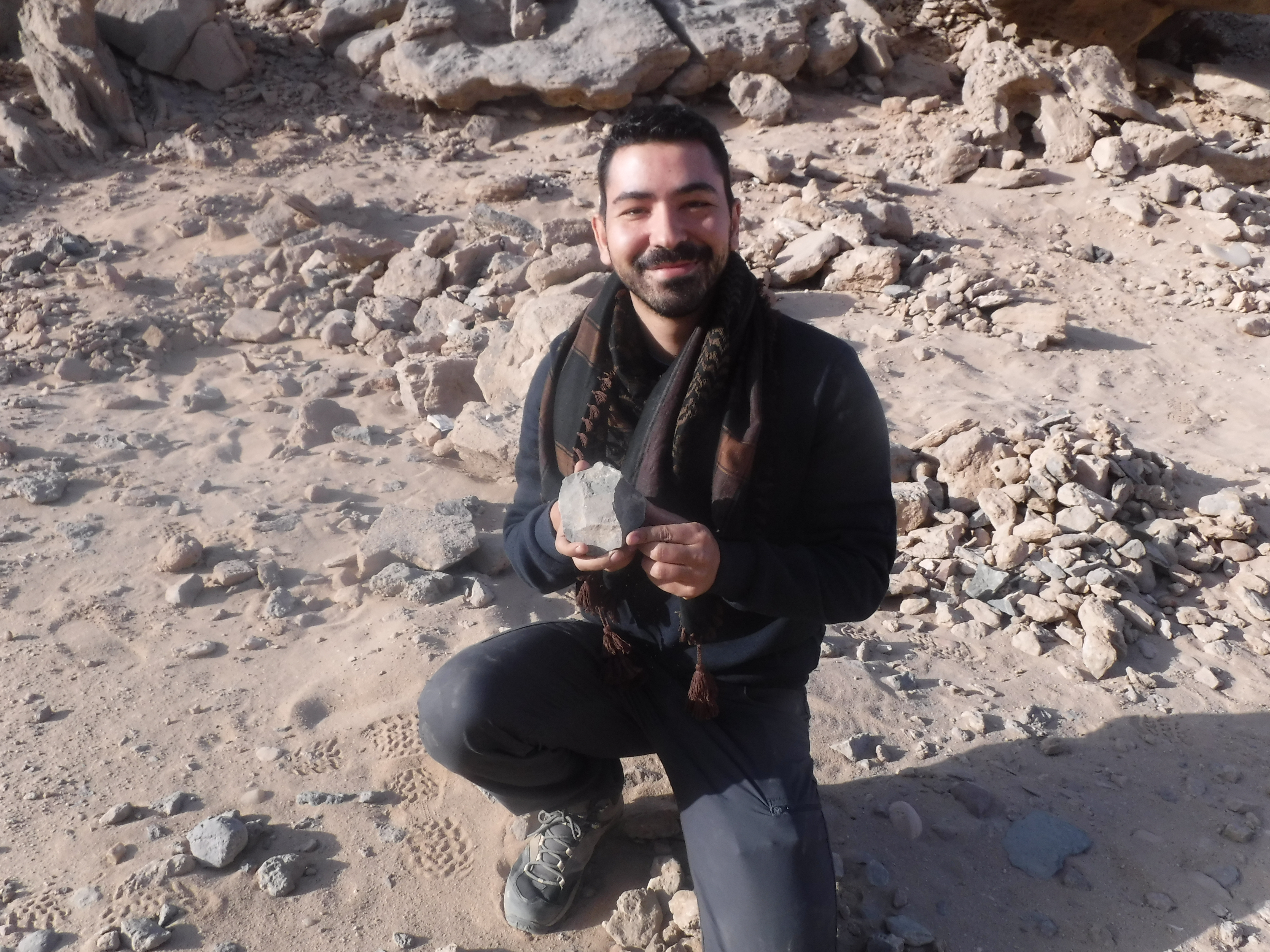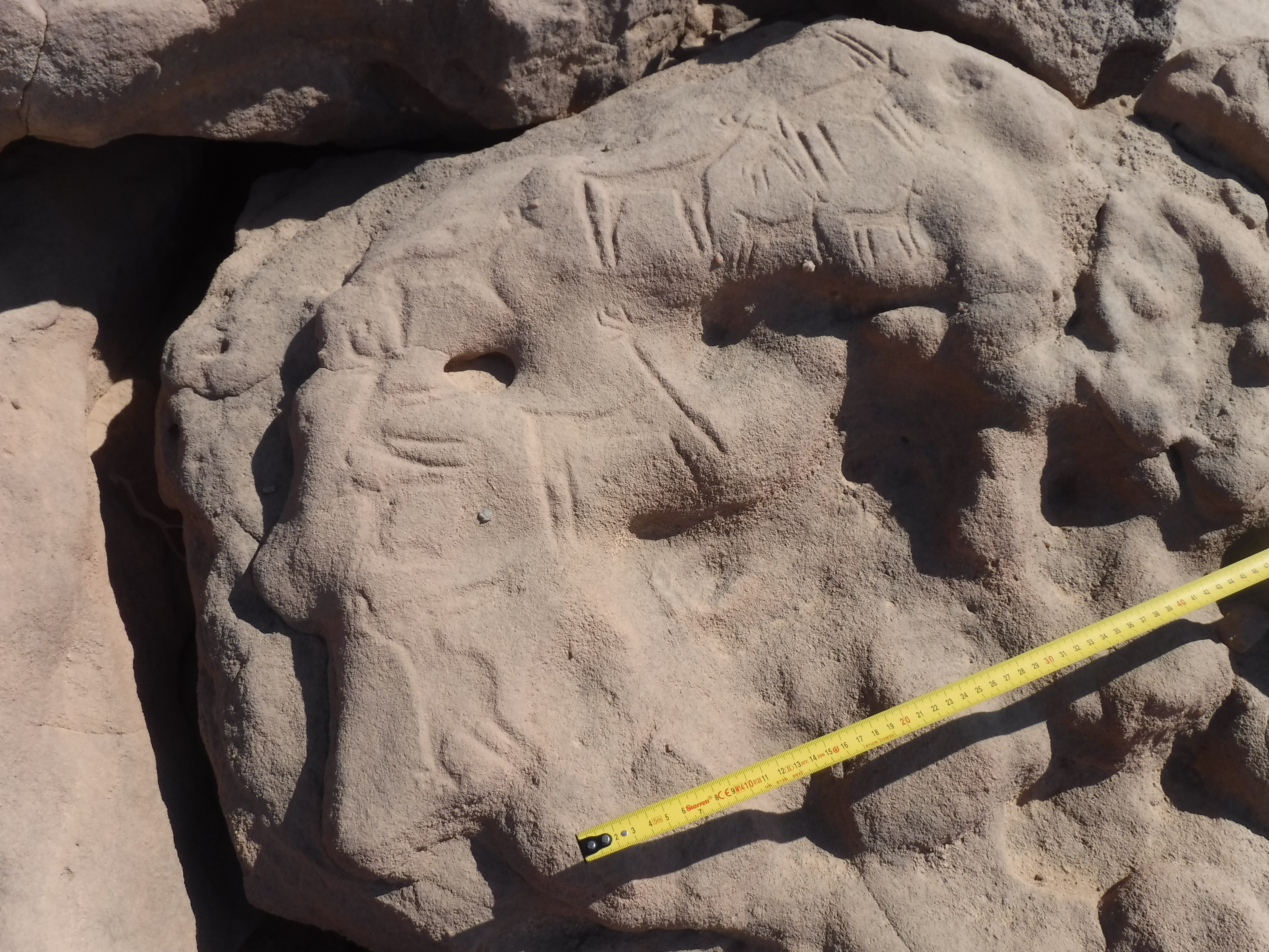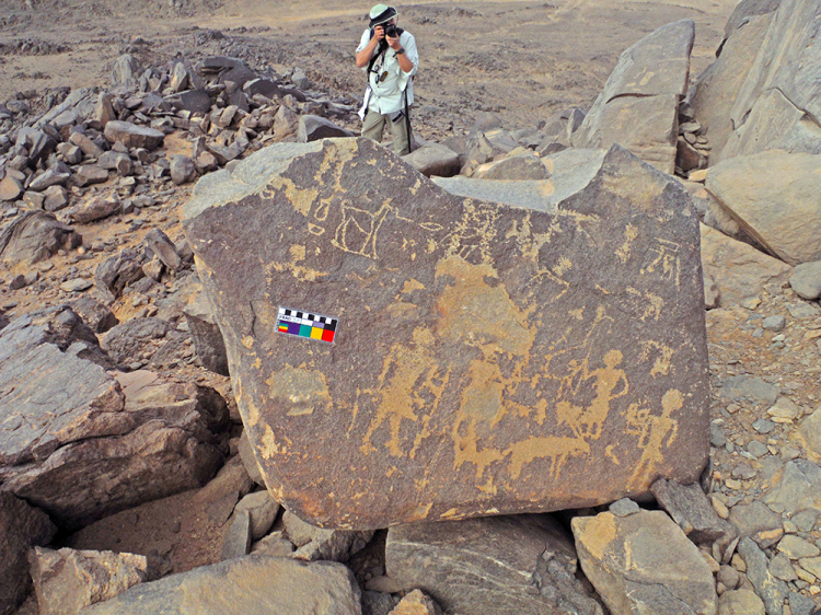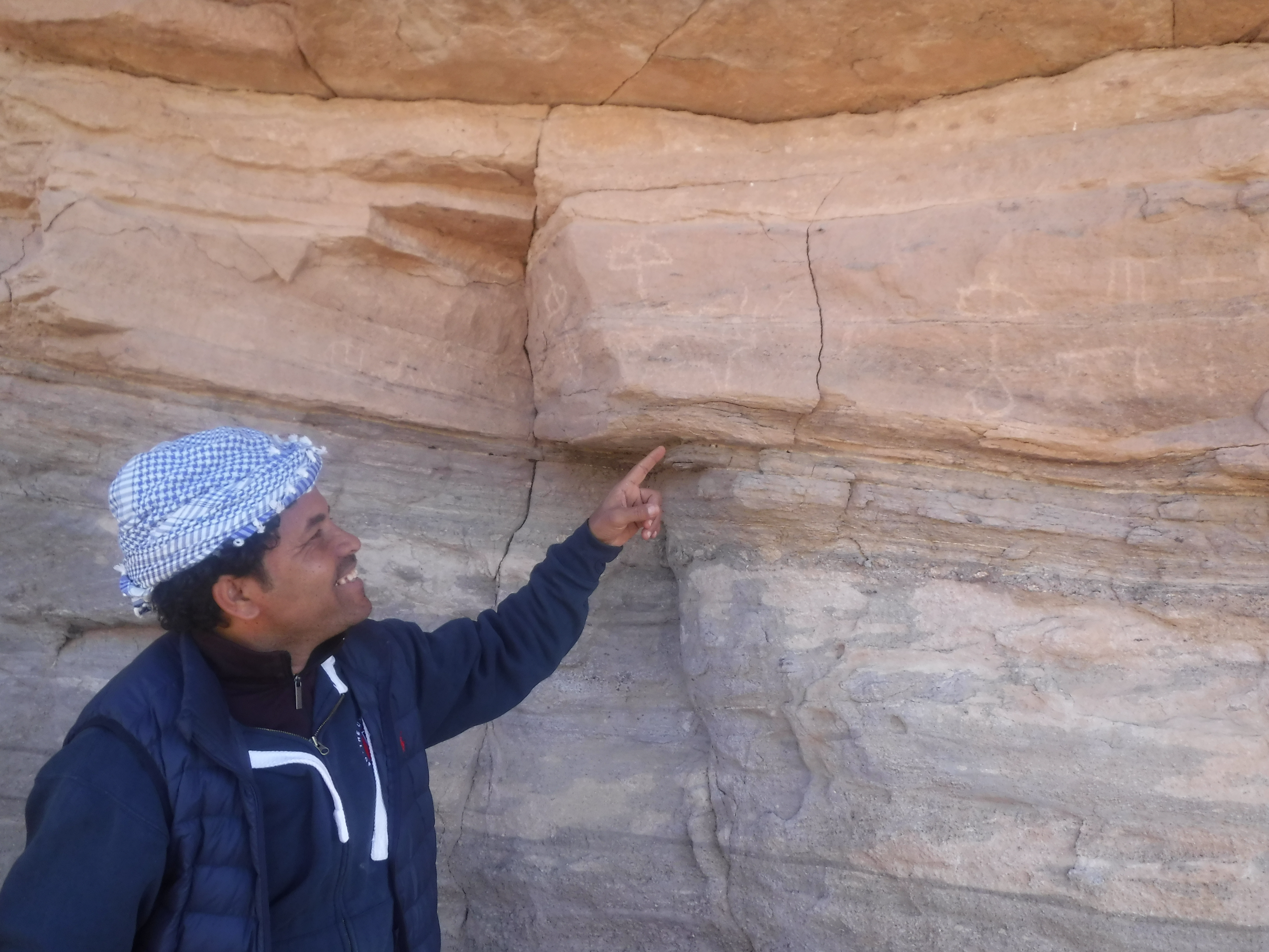 Cuando dimos con el yacimiento 51 en enero de 2023, pensamos que éramos los primeros en descubrirlo porque no es mencionado por Ahmed Fakhry ni otros. Pero pronto nos sorprendió saber que fue descubierto en la década de 1930. El yacimiento 51 fue visitado por primera vez por el explorador y diplomático alemán Hansjoachim von der Esch, según relata en su diario de viaje Weenak – die Karawane ruft. Cuando una inesperada tormenta de arena se levantó, él y su equipo de guías bisharin se refugiaron en el yacimiento 51 por dos días y observaron sus abundantes inscripciones de petroglifos. De hecho, es posible que fueran ellos quienes tallaron allí dos inscripciones en árabe que datan de 1938. Sin embargo, no fueron ni mucho menos las primeras personas en vivir allí.