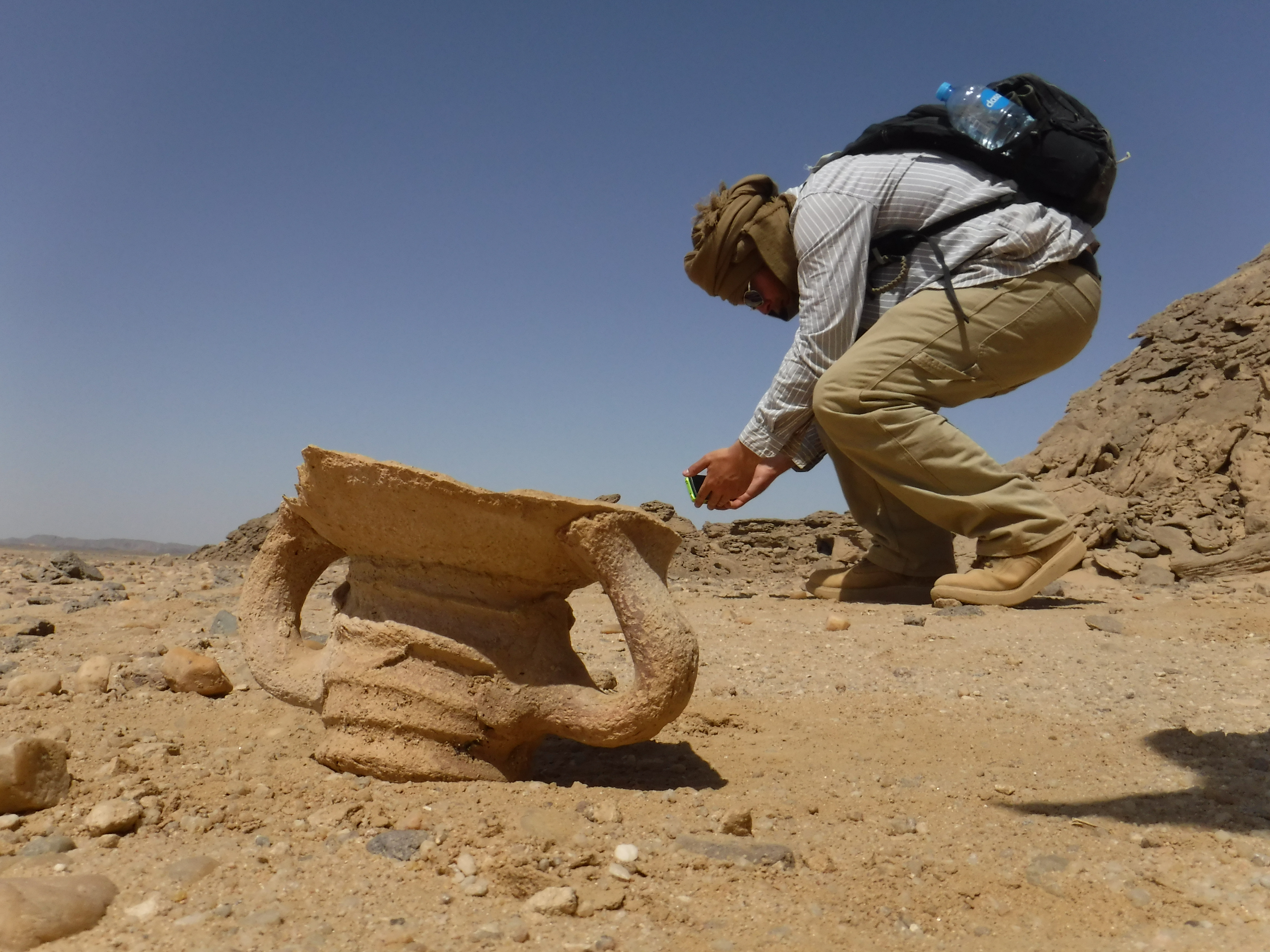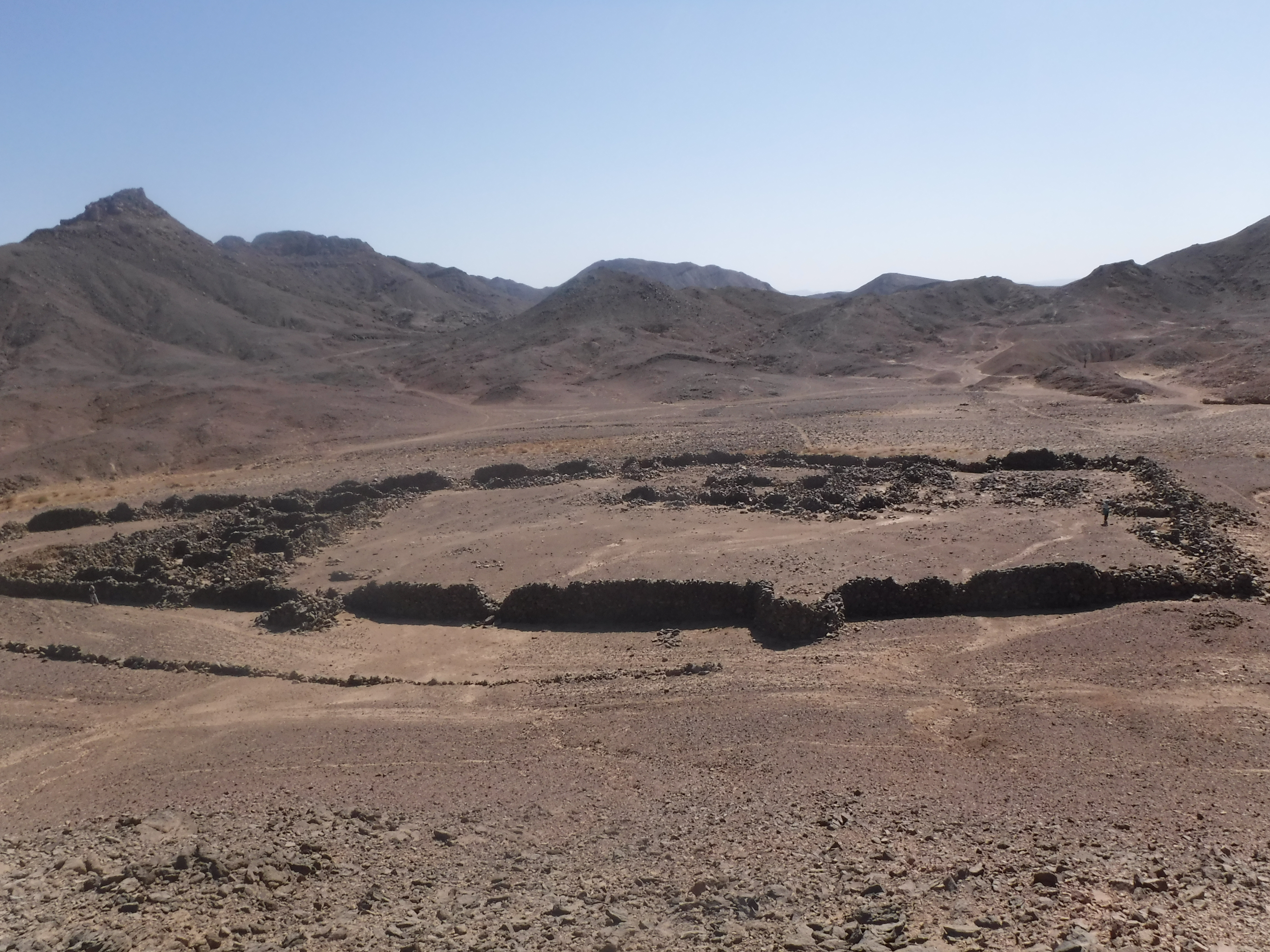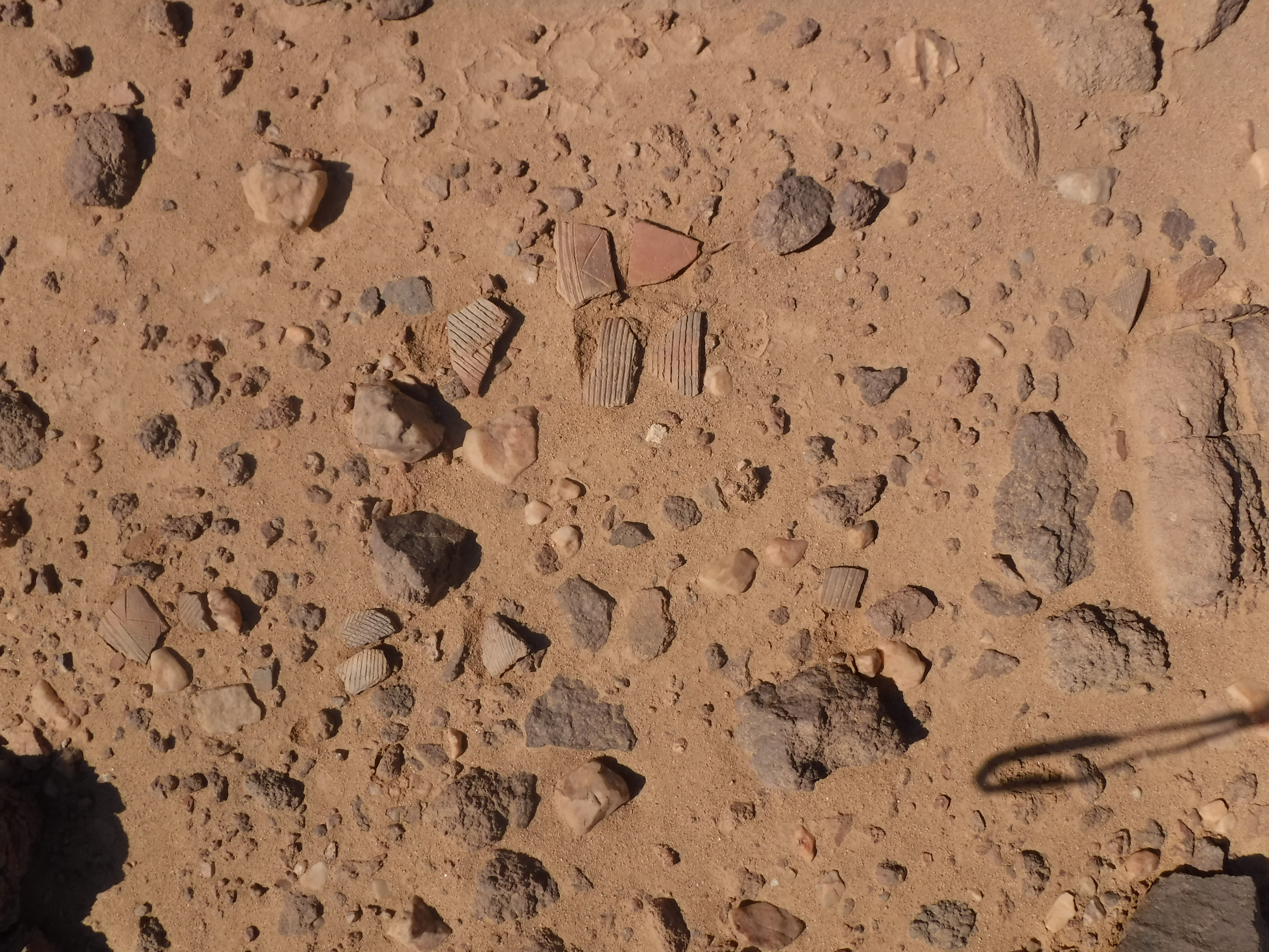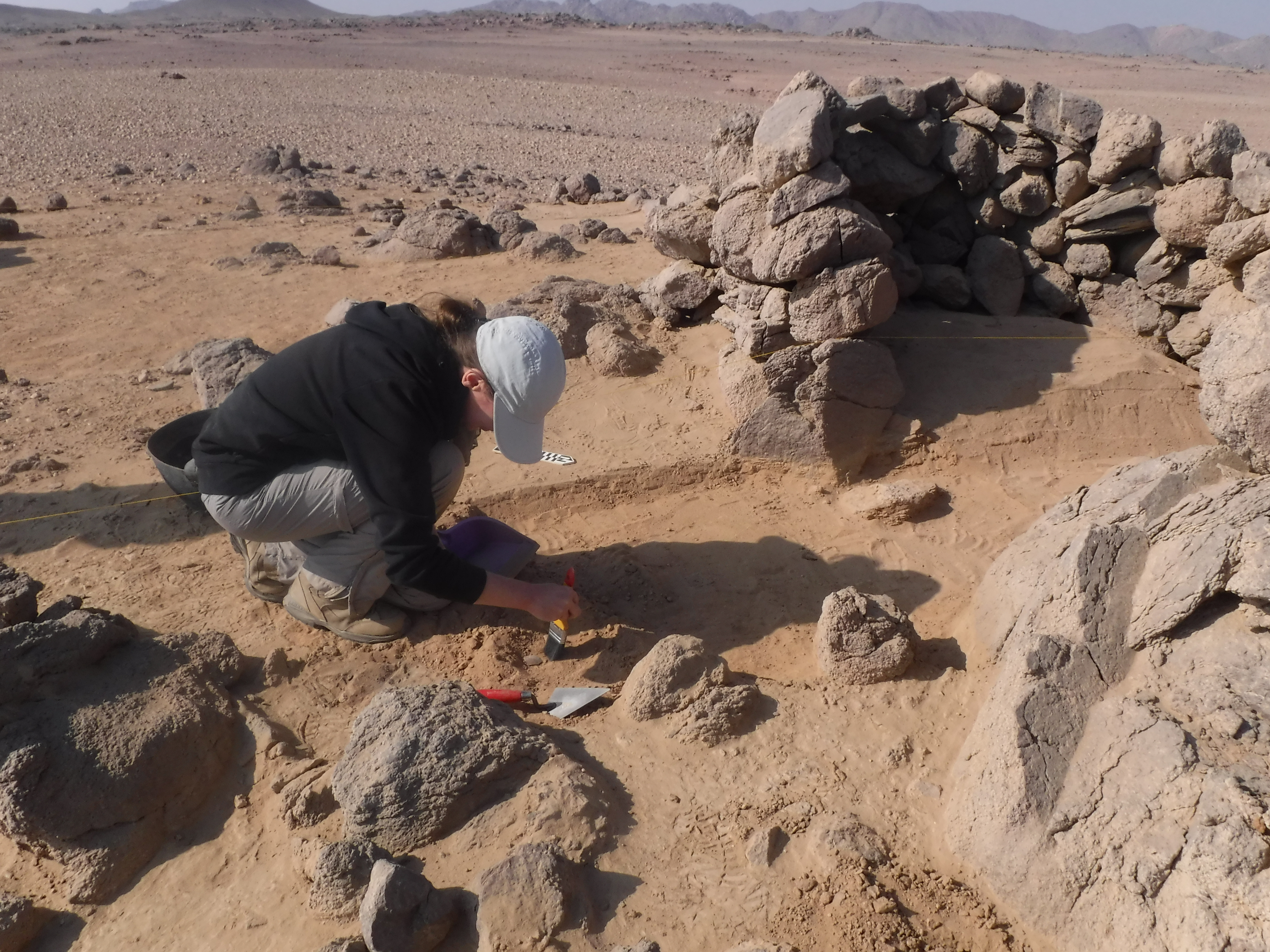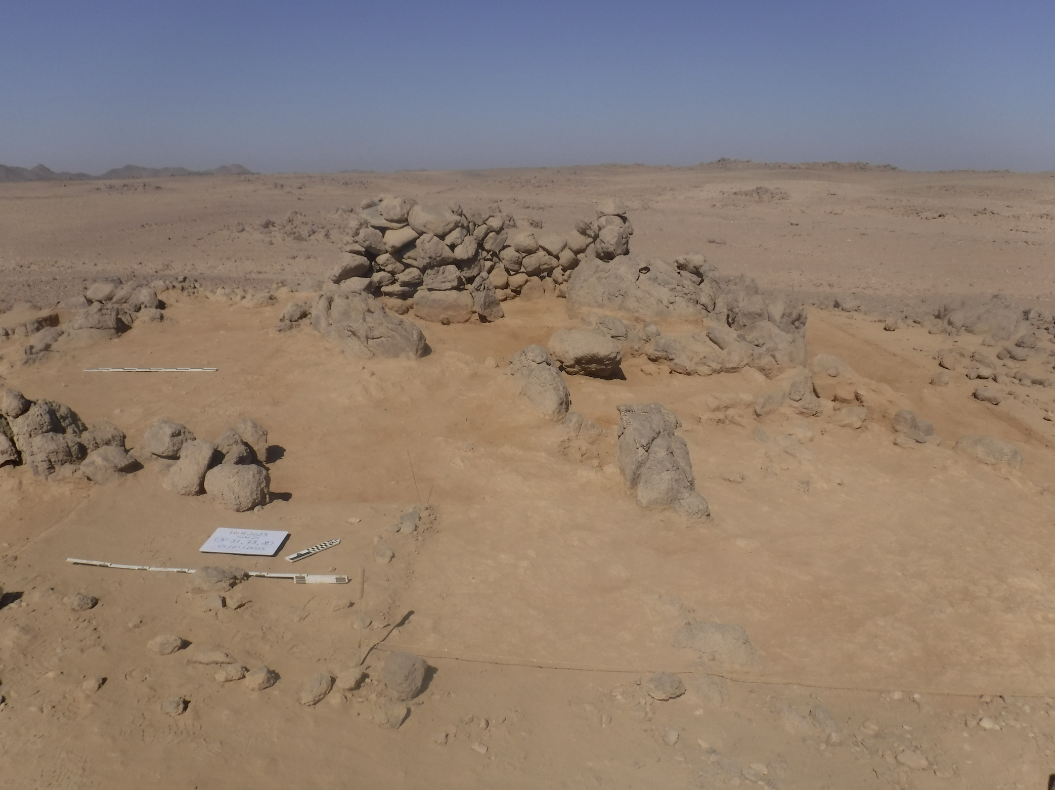 El yacimiento 21 está localizado en una gran llanura arenosa y rocosa sobre la cual las personas construyeron 13 elementos de piedra seca. Cuatro de ellos son grandes cabañas de aproximadamente 2-3 metros de ancho por un metro de alto, con patios y cortavientos adyacentes. Estos elementos están muy distanciados en el paisaje, a menudo a 50 metros de distancia del siguiente. En el lado norte del yacimiento 21 se encuentra el bien conservado Elemento 11, que excavamos en 2023. Data de finales de la dinastía XI hasta mediados de la dinastía XII. Curiosamente cerca del 80% de la cerámica que encontramos aquí es de la Nubia Media. La cerámica es similar a la del Grupo C en cuanto a decoración, composición de la arcilla y tecnología de moldeado, pero también posee diferencias claras. Por ejemplo, algunas de las vasijas nubias fueron hechas con arcillas del desierto. Este hecho implica que los alfareros que las fabricaban recogían la arcilla de fuentes desérticas y posiblemente pasaban gran parte sus vidas en el desierto. Es decir, las personas asociadas a estas vasijas pudieron haber sido nubios locales viviendo al menos a tiempo parcial en el desierto. Los mineros con estas vasijas de estilo nubio también comían y bebían en algunas vasijas de estilo egipcio. Es probable que los mineros regresaran al yacimiento 21 para realizar minería varias veces a lo largo de varios años. Mantenían su espacio vital bastante organizado, quizá durmiendo en la cabaña, procesando la amatista en bruto en el porche frente a la cabaña y cocinando en un espacio ligeramente cuesta abajo.